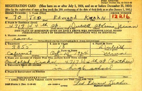 Ted Edward Krahn was born October 15th 1924, in Duluth, Minnesota to Rudolph & Marie (Koehle) Krahn.